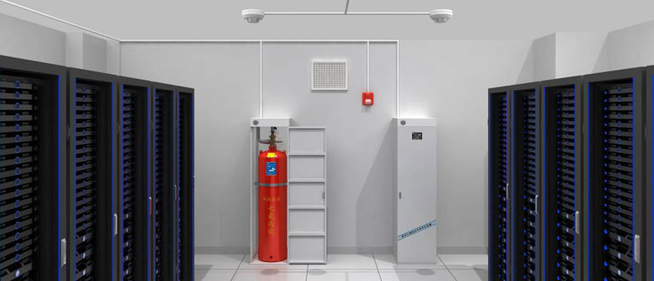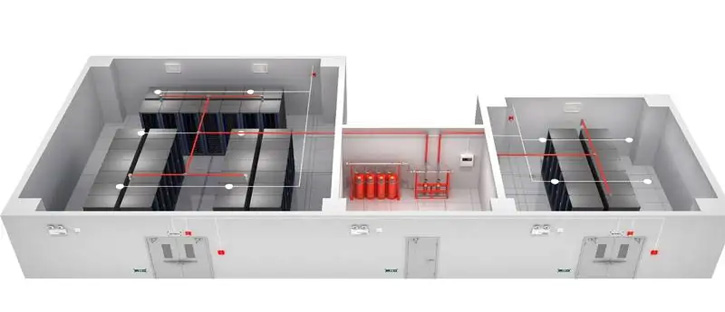 機房消防報警及滅火系統(tǒng)采用有管網(wǎng)全淹沒方式,并采用氣體滅火劑,探測器配置方式為智能感煙探測器、智能感溫探測器搭配,只有兩種探測器同時報警,氣體滅火系統(tǒng)才會發(fā)生聯(lián)動,同時還設(shè)有遠(yuǎn)程手動啟動及機械手動方式。