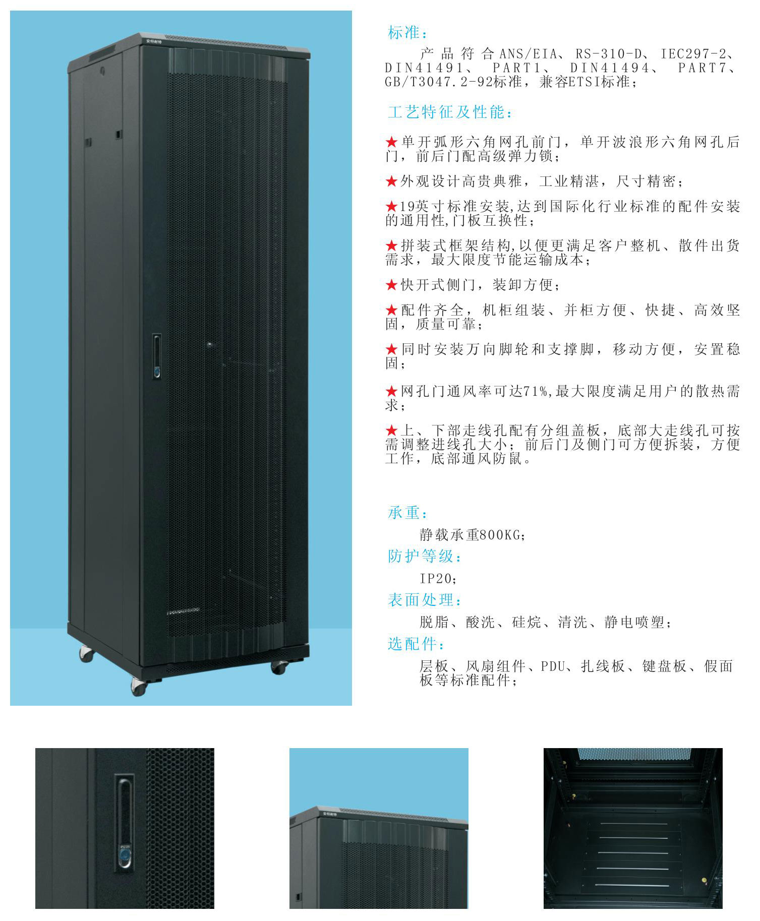 ★ 上、下部走線(xiàn)孔配有分組蓋板,底部大走線(xiàn)孔可按需調(diào)整進(jìn)線(xiàn)孔大??;前后門(mén)及側(cè)門(mén)可方便拆裝,方便工作,底部通風(fēng)防鼠。